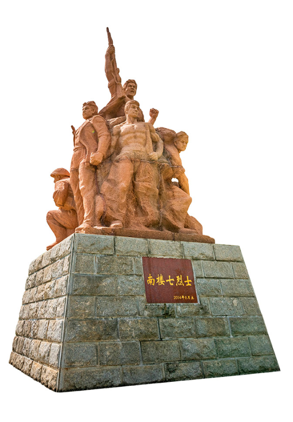 南楼,是一座位于开平市赤坎镇腾蛟村的百年碉楼,墙壁上清晰可见的枪弹痕和炮弹孔,见证着七烈士英勇抗战的英雄事迹。1945年7月,日军急于打通雷州半岛至广州的水上撤退路线,兵分三路进犯赤坎。司徒氏四乡自卫队据守南楼,抗击沿潭江进犯的日军。为掩护父老乡亲转移和队友突围,7名壮士自愿留下。他们凭楼坚守10天,射杀日军16人,拖延了日军借道侨乡水路撤退的计划,最后英勇就义。南楼原址现在建成了南楼纪念公园,民众在这里感悟革命先辈不屈不挠、舍生忘死的抗战精神。
